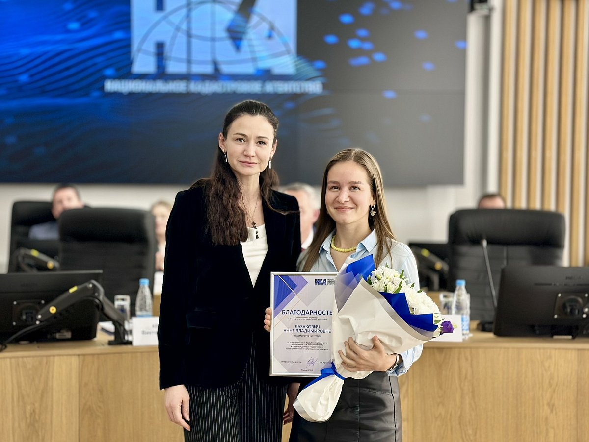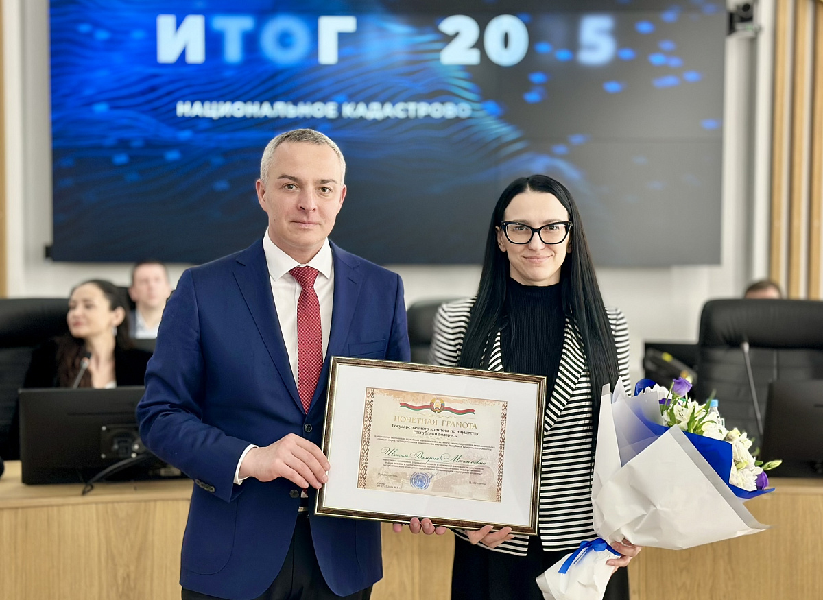 Председатель Госкомимущества Виталий Невера вручил работникам Агентства благодарности и Почетные грамоты Госкомимущества. Ведущий специалист по работе с клиентами отдела информационного взаимодействия Национального кадастрового агентства Оксана Михнович удостоена права занесения на Доску Почета Государственного комитета по имуществу.