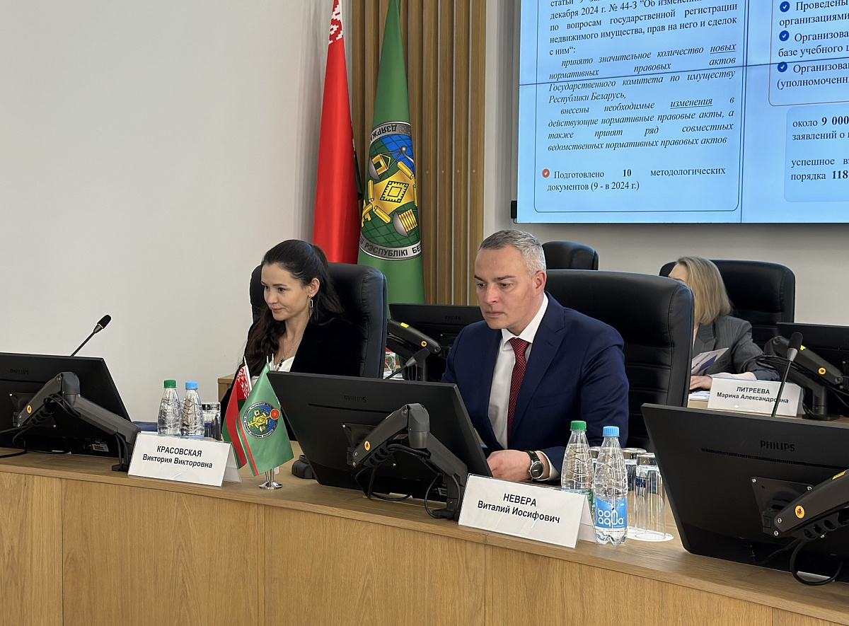 В собрании приняли участие Председатель Государственного комитета по имуществу Виталий Невера, председатель общественного объединения «Белорусское географическое общество» Алексей Яротов, а также, в формате видеоконференцсвязи, представители всех территориальных организаций по государственной регистрации недвижимого имущества.