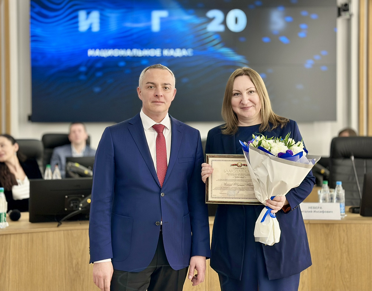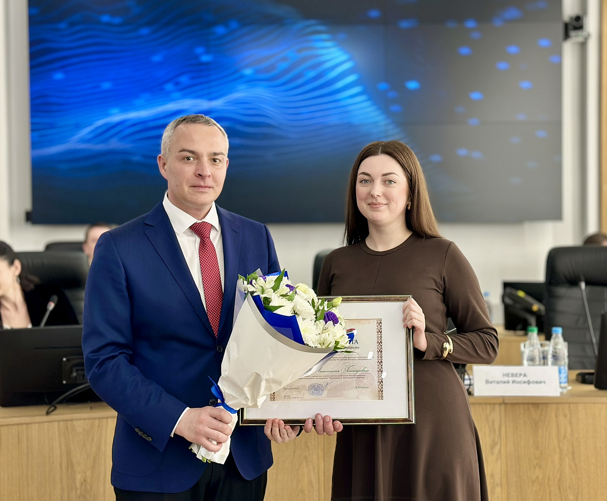 Председатель Госкомимущества Виталий Невера вручил работникам Агентства благодарности и Почетные грамоты Госкомимущества. Ведущий специалист по работе с клиентами отдела информационного взаимодействия Национального кадастрового агентства Оксана Михнович удостоена права занесения на Доску Почета Государственного комитета по имуществу.