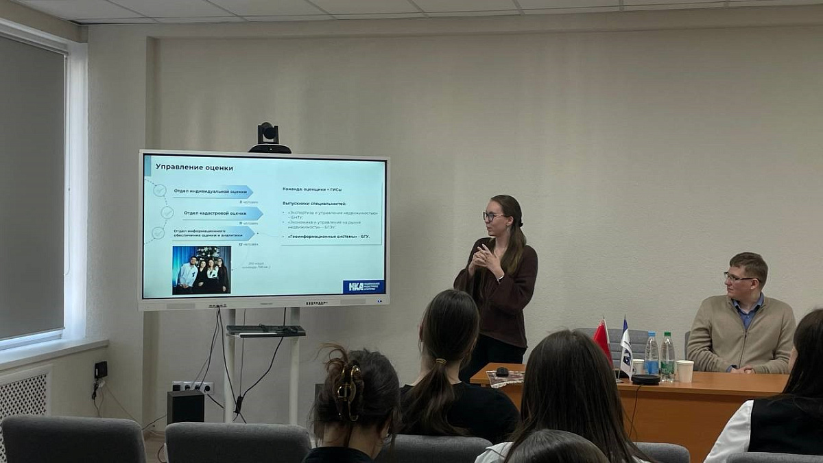 С приветственным словом перед учащимися выступила начальник управления геоинформационных систем Марина Литреева, которая совместно со специалистом по кадастру и ГИС управления формирования недвижимости Татьяной Савицкой и специалистом по кадастру и ГИС управления оценки Анастасией Жуховцовой рассказала учащимся об основных направлениях деятельности Национального кадастрового агентства.